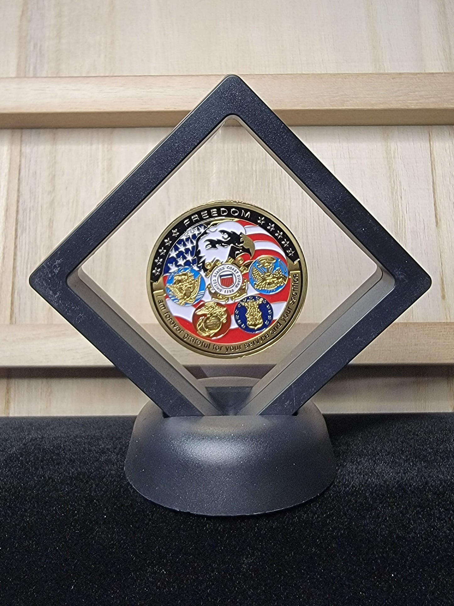 USA Military All Branches Challenge Coin with Floating Display Case – Army, Navy, Air Force, Marines, Coast Guard | Discount Cave